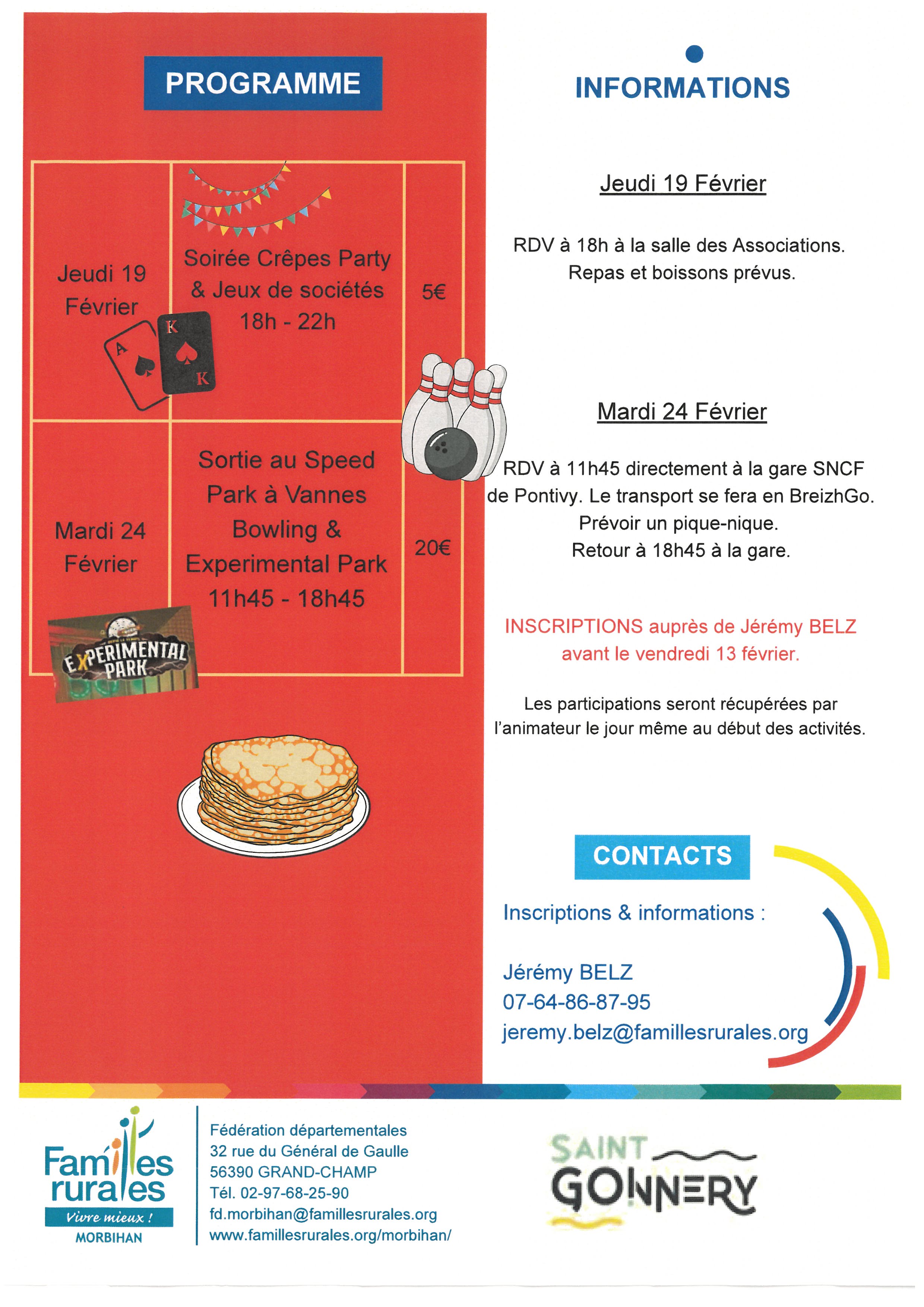Informations et inscriptions auprès de Jérémy Belz au 07 64 86 87 95 ou jeremy.belz@famillesrurales.org